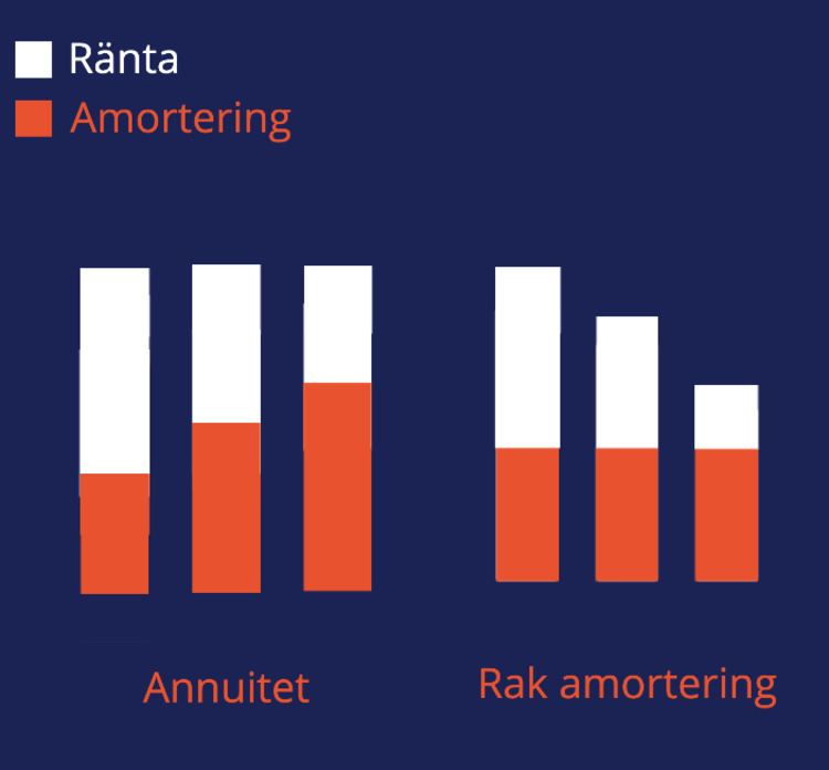 Rak amortering betyder att du betalar ett fastsatt belopp varje månad. I början av lånets löptid är beloppet högre. Det kan tyckas konstigt men avbetalningsbeloppet hänger ihop med räntan och lånets skuld.