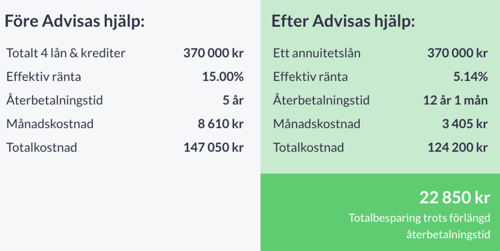 Men efter att ha tagit ett större annuitetslån via Advisa för att betala sina tidigare lån och krediter så kunde de sänka sin effektiva ränta från 15 % till 5,4 %!